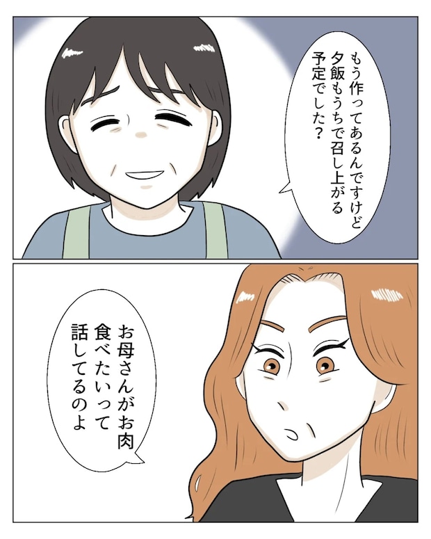 毎回夕飯を作り終わるタイミングで要求してくるのも不思議です。一応多めには作ってあるのですが、こちらから「準備しましたよ」と伝えることはしません。「もう作ってあるんですけど、夕飯もうちで召し上がる予定でした?」真矢ほどではありませんが、私も精一杯応戦します。しかし、その言葉には全く威力がないのか「お母さんがお肉食べたいって話している」と平然と言ってきます。