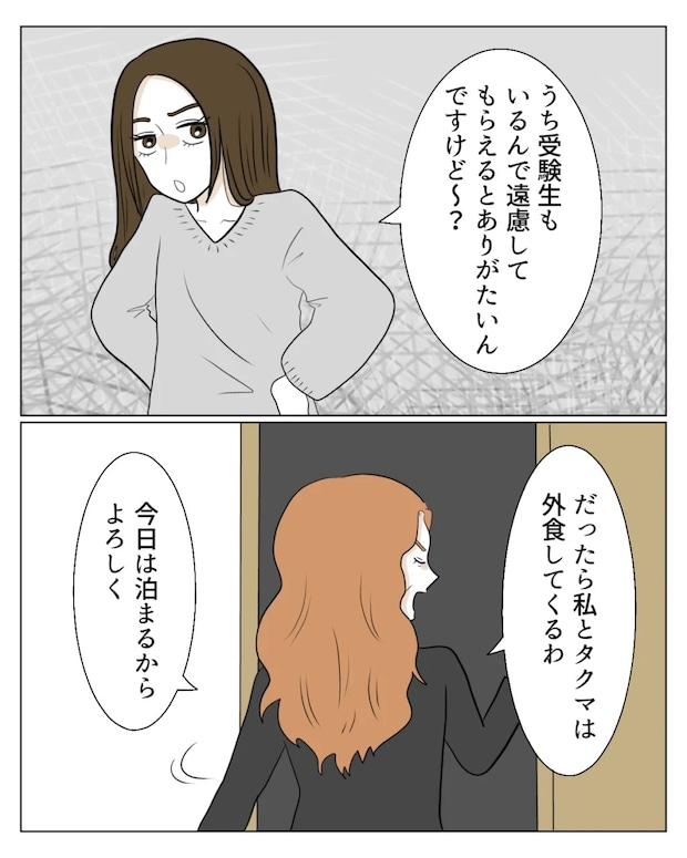 あまりの身勝手さに、真矢が「うち受験生もいるんで、遠慮してもえらえるとありがたいんですけど~」と早く帰ってほしい雰囲気を出しますが、「だったら私とタクマは外食してくるわ。今日は泊まるから。」と言い捨て、外出していきました。