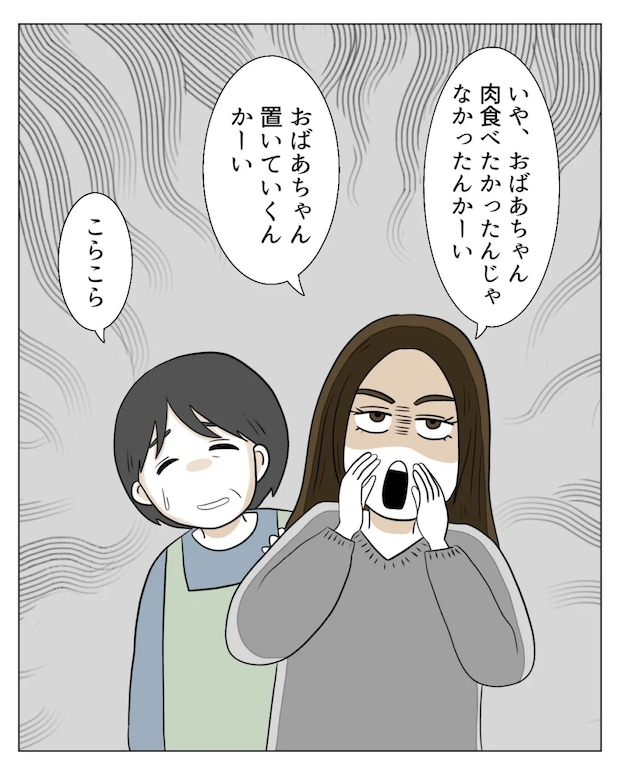 どうやら、お肉を食べたかったのはエミさんとタクマくんだったようです。「おばあちゃんが食べたかったんじゃないんかーい。おばあちゃん置いていくんかーい。」と、真矢が2人にツッコミを入れますが、エミさんとタクマくんには届かないようです。