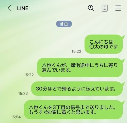 お母さんは子供会のグループLINEだけ交流があったので、友達追加して、今うちにいること、30分ほどで帰らせることをLINEしました。