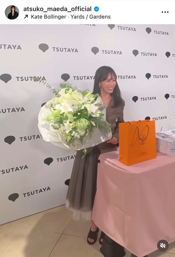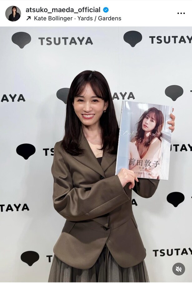 公開された画像では、ブラウンのジャケットに同系色のチュールスカートを合わせ、写真集を手に微笑む姿や、白いレースのトップスに濃紺のボトムスでスタイルの良さを際立たせた振り向きショットを投稿。さらに、足元の美しさが際立つハイヒールでポーズを決めるカットや、赤リップが印象的な表情で頬杖をつく姿のほかに、大きな花束を片手にカメラへ天真爛漫な笑顔を見せる様子や、大量の写真集を前にした前田がカメラに向かって無邪気に手を振る姿を収めた動画などもあわせて公開された。