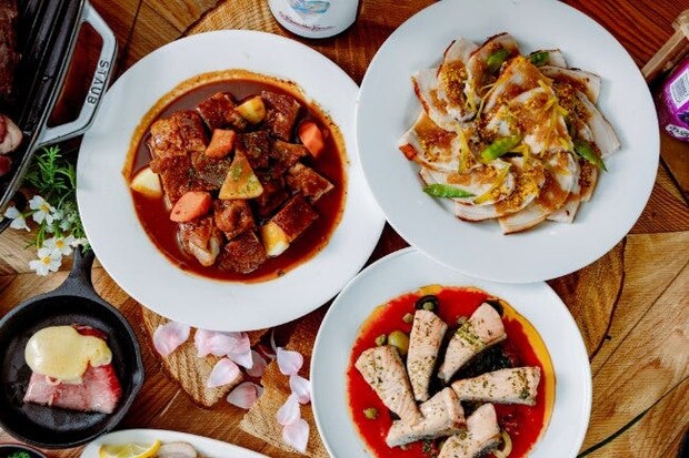 ホテルレストランの技術を活かしたビストロフレンチメニューも充実。なかでも、鶏肉を赤ワインで煮込んだブルゴーニュ地方の代表的な料理「コック・オ・ヴァン」はぜひ食べたい1品。ほかにも、低温で焼きあげた豚肉にマスタードの酸味が活きたシャルキュティエールソースをかけたフランスの伝統料理「ポークの低温ロースト シャルキュティエール風」や、フランス南東部のプロヴァンス地方の特色を生かしたトマトベースのソースで味わう「ハーブでマリネしたサーモンのオーブン焼き プロヴァンサルソース」といった品々もラインナップ。