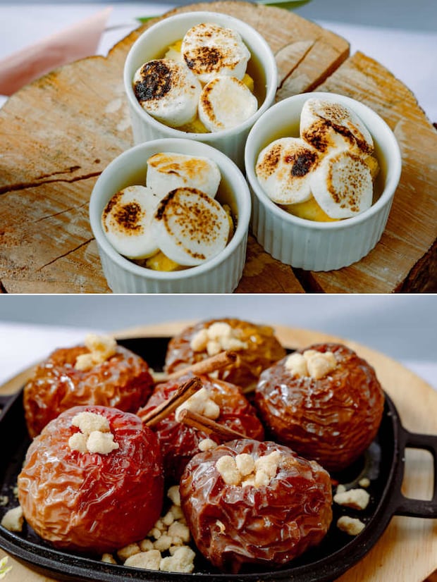 デザートコーナーには、キャンプの定番「焼きマシュマロ」や、素材の甘みを存分に引き出した「リンゴの丸焼き(ポム・ロティ)」がラインナップ。食事メニューだけでなくデザートでも、グランピングのワクワク感に浸ることができる。