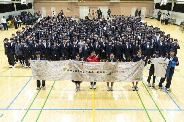 授業の最後には、全校生徒がそれぞれの夢や自分への応援メッセージを書いた巨大な横断幕が披露されました。
