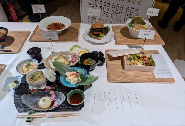 中でも、修行体験も人気の犬鳴山七宝瀧寺の「精進弁当」は、筍ご飯、春巻き、大豆ミートボール、大豆ミートの唐揚げ、クリームペンネ、カプレーゼを彩りよく詰め合わせた。さまざまなミラダシと、大豆ミート、豆乳クリーム、豆乳クリームバター、豆乳からできたブロックチーズのような豆乳発酵食品など、不二製油が展開する植物性素材がふんだんに使われていた。