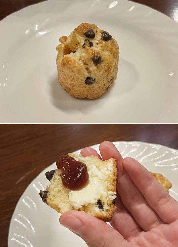 チョコチップスコーンは外側がサクッと軽く、中はしっとり。砂糖漬けにしたオレンジの果肉と、チョコの甘味がしっかりと感じられ、何もつけなくても満足感があります。