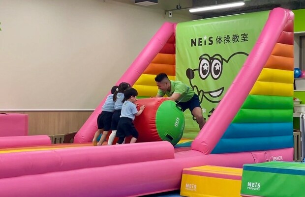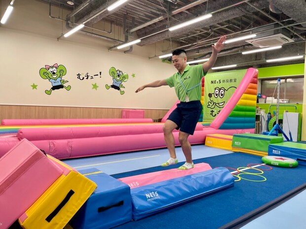 ネイスの強みは、独自開発のオリジナル器具にもあります。ネイスプロダクツ事業も展開しており、教室の95%の器具は自社開発製造。虹色の大型トランポリンなど、子どもが“思わずやりたくなる”設計が特徴です。
