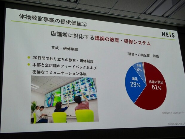 しかし、同社が最も重要視するのは「講師」。保護者アンケートでは、講師満足度「非常に満足」が61%と高水準を維持。全教室に設置されたカメラ映像を本部品質管理部がモニタリングし、事故防止や指導改善に活用しています。教室では少人数制を採用。講師との距離を近く保ち、「先生に会いたい」と思える関係づくりを大切にしているそうです。
