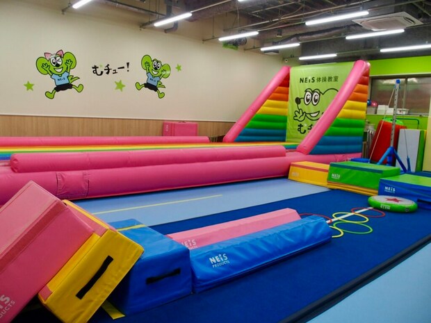 ネイス体操教室は1歳10ヵ月~3歳を対象に2時間30分の「預かり型幼児体操教室 キッズクラス」と、年少~小学6年生を対象とした45~50分のクラスを開講しています。教室内にはオリジナル器具が並びとってもカラフル。