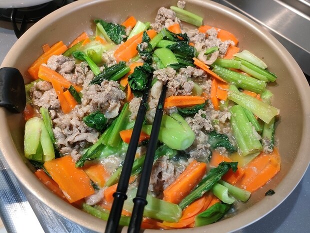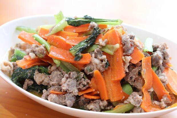 味が濃いめに感じられる場合もあるため、小松菜や人参などの野菜を加えて一緒に炒め、カサ増しをするのがおすすめです。野菜を追加しても薄味にならず味のバランスが良くなり、4人前以上のボリュームになります。