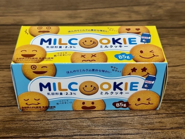 売り場でパッと目を引く、黄色と青の可愛らしいパッケージが目印のクッキーです。箱の側面にもイラストが描かれた、楽しいデザインになっています。