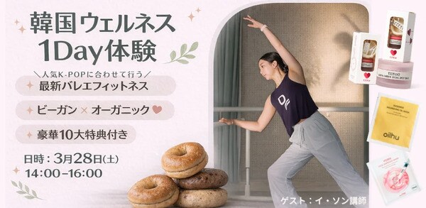 「韓国ウェルネス 1Day 体験」は、K-POPに合わせて行う韓国式バレエフィットネスのほか、日本未上陸を含むヴィーガンコスメ、韓国式米粉ベーグルを一度に体験できる女性限定の1Dayワークショップとなっている。
