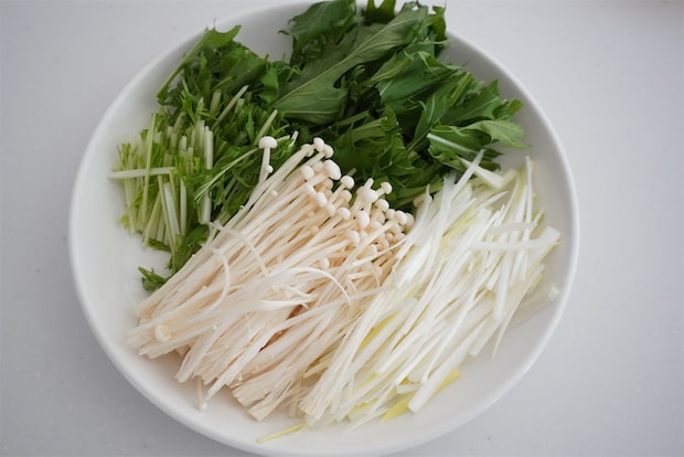 水菜は5~7cmに切って白ねぎは千切り、えのきたけは石づきを取ってほぐしました。
