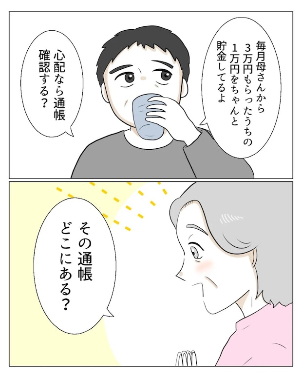 「毎月母さんから3万円もらったうちの1万円をちゃんと貯金してるよ。心配なら通帳確認する?」和也さんがそう答えると、「その通帳どこにある?」お義母さんが目を輝かせて通帳のありかをたずねました。