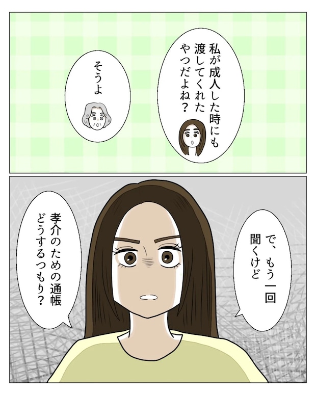 真矢は「私が成人した時にも渡してくれたやつだよね?」と言い、「そうよ」と答えるお義母さんに、「で、もう1回聞くけど、孝介のための通帳どうするつもり?」何かを確信したように真矢がお義母さんにそう言うと、