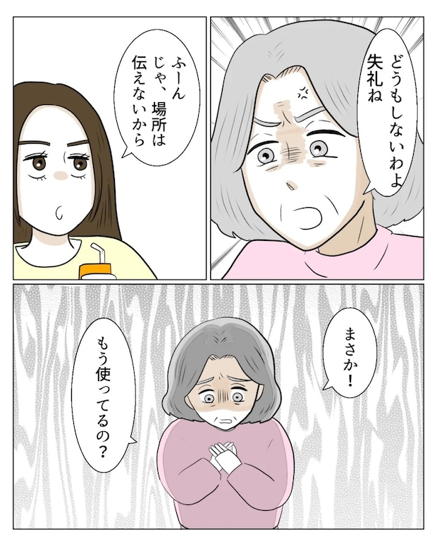 「どうもしないわよ。失礼ね」と途端に怒り出し、「ふーん。じゃ場所は伝えないから」真矢の言葉を聞いたお義母さんは、「まさか!もう使ってるの?」と顔を曇らせて言うのでした。