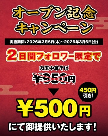 3月5日(木)・6日(金)の2日間、Instagram公式アカウントをフォローした人限定で、通常950円(税込)の「肉玉中華そば」がワンコインの500円で提供される。