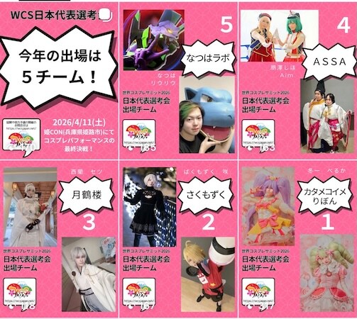 「世界コスプレサミット2026 日本代表選考会」が4月11日(土)15:50〜50分にアクリエひめじで開催される。8月に愛知県名古屋市で行われる本選への出場をかけて、5つのチームが競い合う。