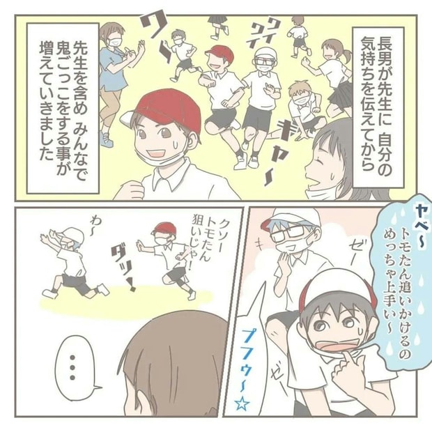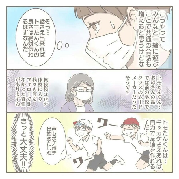 コロナ禍の余波でいろいろなものが制限されていた時期。先生はトモたんのために、皆での交流の場を確保します。周りの大人の助けの甲斐あって、トモたんは少しずつ友だちとのコミュニケーションを取るようになったです。