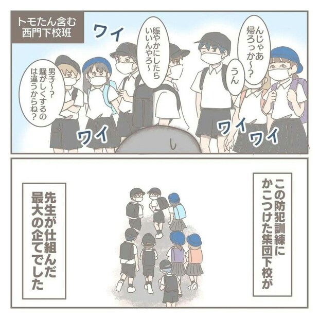防犯訓練の一環として行われた、集団下校。これこそが、先生の仕組んだ最大の作戦だったようです。集団で賑やかに帰ることで、どのような効果があるのでしょうか。