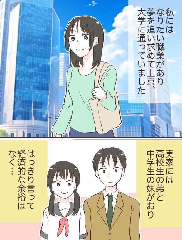 実家から通える大学は無いと分かっていても、夢を諦めきれずに上京しての大学進学を目指した私、まひろ。経済的な余裕がない我が家には、高校生の弟と中学生の妹がいます。