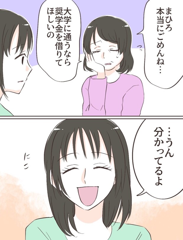 母に「大学に通うなら奨学金を借りて欲しい」と、申し訳なさそうに言った母の顔は忘れられません。そんなこと分かってる。私は笑顔で答えました。