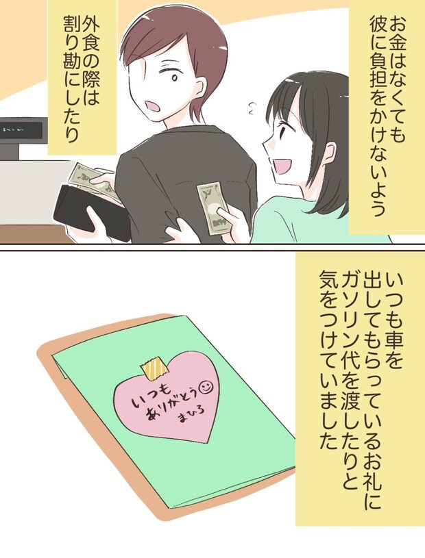 お金はなかったけれど、彼に負担をかけないように気を使って、外食の際は割り勘にしたり、いつも車を出してもらっているお礼にガソリン代を渡したりと気をつけていました。