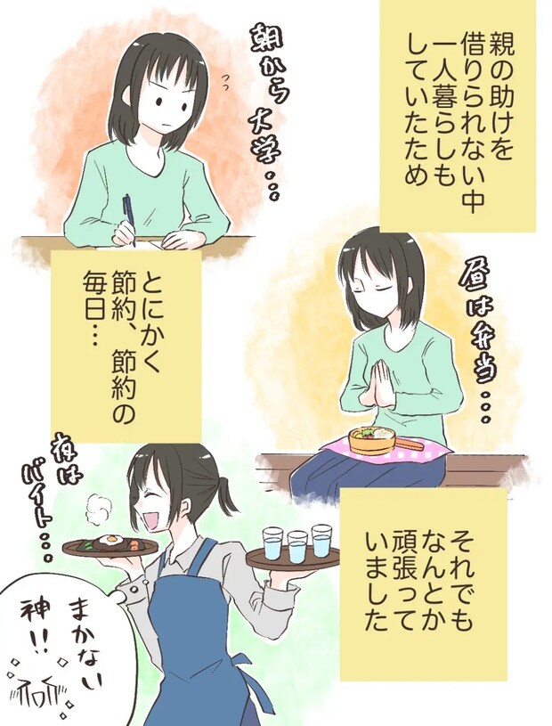 親には絶対に負担はかけられない。上京して一人暮らしの私は、毎日お弁当を作ったり、夜はまかない付きの飲食店でバイトしたりと、とにかく節約節約の毎日を送っていました。
