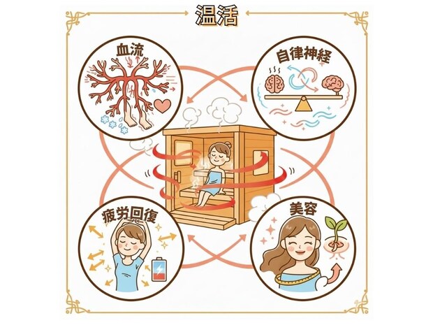 サウナの魅力は、単なる発汗にとどまらず、全身にさまざまな良い影響が期待できる点にあります。まず一つ目は、「手足の冷えの改善」です。体をしっかり温めることで血管が拡張し、血流が促進されるため、末端の冷えが和らぎやすくなります。二つ目は、「疲労回復やリフレッシュ効果」です。発汗によって爽快感が得られ、心身ともにリセットされた感覚を得やすくなります。