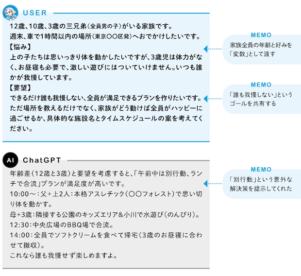 家族全員の要望を叶えるのは高度なパズルですが、AIはそれを「分担と合流」という形で解いてくれました。全員が少しずつ妥協するのではなく、それぞれの「やりたい」を尊重するプランニングは、家族全体の満足度を高めてくれます。検索では出てこない「我が家に最適なタイムスケジュール」をAIが設計してくれたおかげで、誰かが不機嫌になる休日が少なくなりました。帰り道、遊び疲れた子どもたちの寝顔を見ながら、「いい日だったな」と夫婦で頷き合える幸せ。情報を探す時代から、自分たちに合わせて構成してもらう時代へ。頼れるパートナーを得た気分です。