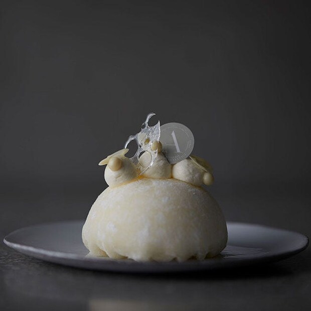 クレームダンジュを真っ白な求肥で包み込み、飴細工でデコレーション。そっとフォークを刺せば、中に忍ばせたフルーツのソースが顔をのぞかせる。3種類のチーズのクリームと、シーズンごとに変わるフルーツとのコンビネーションを楽しんで。