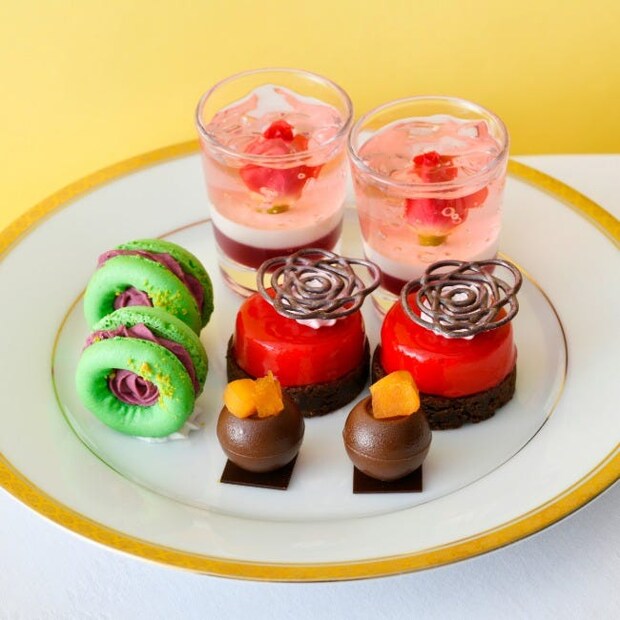 真っ赤なグラサージュが艶やかに輝くのはバラが香る濃厚なフランボワーズのムース。口に含んだ瞬間に広がる高貴な香りにうっとりとしてしまうはず。また、3層の華やかな味わいを重ねたミニパフェ仕立ての「薔薇とブラッドピーチ ココナッツのヴェリーヌ」は、見た目の美しさはもちろん、食べ進めるごとに変化する繊細な味わいが楽しめる。