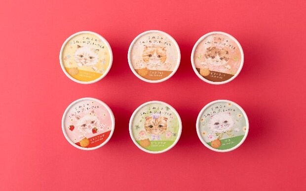 こねこのこねこねクッキーアイスのカップには、利光春華さんのねこのイラストが描かれています。またオンラインショップでお取り寄せも可能。ねこ好き仲間みんなで楽しく味わいたい!