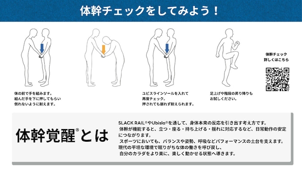 「体幹覚醒」とは、身体本来の反応を引き出す考え方のこと。 体幹の反応が引き出されることで、立つ・座る・持ち上げるといった日常動作の安定や、スポーツにおけるパフォーマンスの土台を支えます。