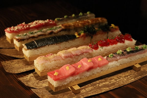 自慢の「押し寿司」各980円は、握りよりもカジュアルに、寿司を楽しめる。