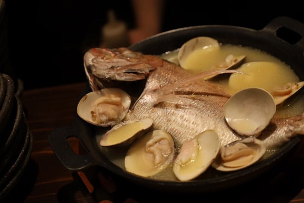 「漁師の小鯛酒蒸し」1,480円は、鯛を丸ゴと一匹使った酒蒸し。
