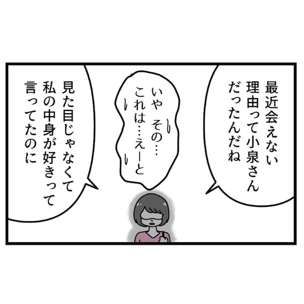 浮気がバレてしどろもどろになる光一に、優菜は「私の中身が好きって言っていたのに」と、思いの丈をぶつけます。
