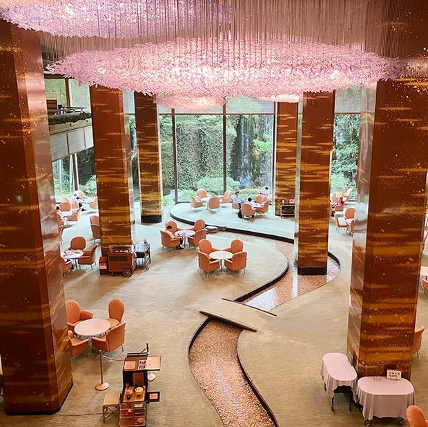 会場は、ロビー奥に広がる吹き抜けのメインラウンジ。高い天井には「紫雲」をイメージしたシャンデリアがたなびき、足もとからは水の回廊のせせらぎが聞こえてきます。窓の外には四季折々の表情を見せる日本庭園と滝庭、柱には金蒔絵、壁には極彩色の源氏物語絵巻が飾られ、上品で荘厳な雰囲気が非日常を演出しています。