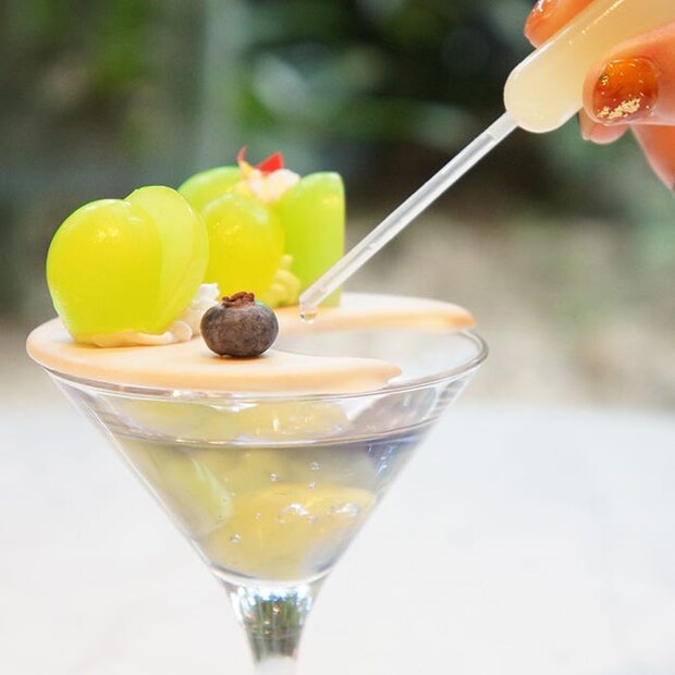 そんな中、遊び心にあふれる仕掛けで目と口を楽しませてくれるのが、「シャインマスカットのゼリーパフェ」。グラスの中にはシャインマスカットとジュレがあるものの、主役は大粒のシャインマスカットとブルーベリーが乗った三日月型のクッキー…と思いきや、添えられたスポイトに注目を。