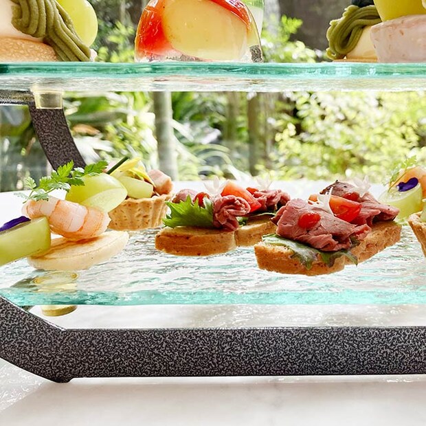 「海老とシャインマスカット、ブリニのピンチョス」「合鴨スモークとシャインマスカットのタルト」「ローストビーフのオープンサンド」といったセイボリーは甘みと塩味のバランスが絶妙。海老や合鴨もしっかりしたお味があるのに、それを包み込むジューシーなシャインマスカットとの相性のよさに驚かされます。これは新しい発見! ティータイムにぴったりの「レーズンスコーン」まで揃う、贅沢なラインナップです。