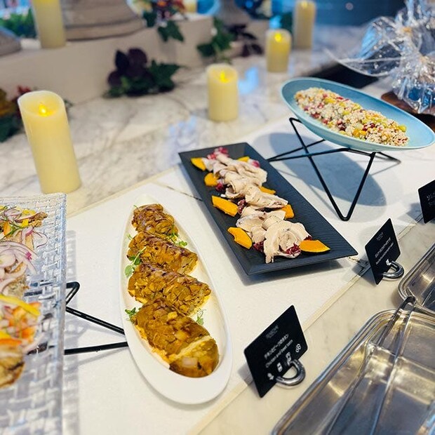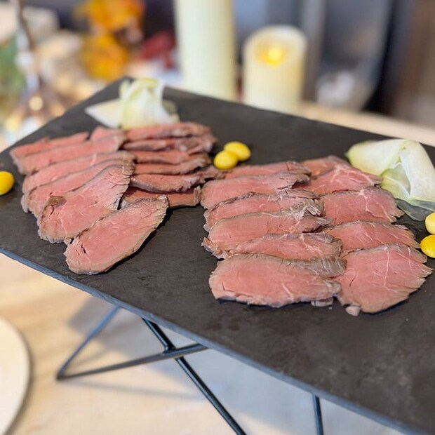 肉厚ローストビーフをはじめ、秋鮭、さんま、きのこ、カボチャ、さつまいもといった秋の味覚をふんだんに使用した料理、さらにフレッシュなシャインマスカットも登場。グルメな秋にふさわしい絶品尽くしのビュッフェに。