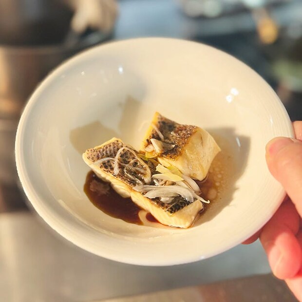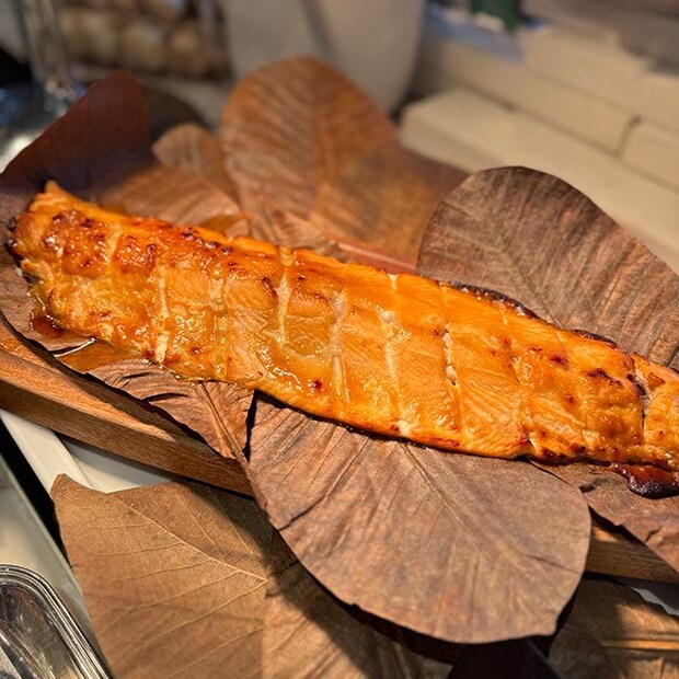 ダイナミックに盛り付けられてインパクトのあった「秋鮭の朴葉焼き 柚子味噌風味」。柚子味噌の爽やかな香りが立ち、鮭はしっとりとした食感。甘辛い味わいが最高です。