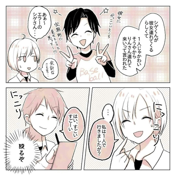 ゆーさんからの草野球の誘いに、思わず行きたくない気持ちが顔に出てしまったりんさん。チームメイトのシゲさんの彼女の話し相手にと言われたものの、自分のときは一人で行ったのにと少し嫌味を言ってしまいます。