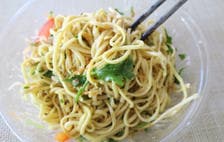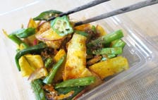 大ぶりにカットしたオクラの他にも、キャベツ、青ネギ、マッシュルーム、人参、しいたけなどたくさんの具材が入ったシンガポール風焼きビーフン。