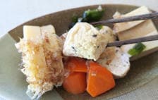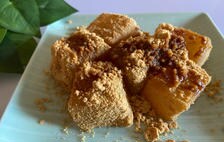 素揚げしたかぼちゃをバルサミコ酢、白ワインビネガー、ハチミツ、レモン果汁、醤油を加えた甘酸っぱいドレッシングで和えています。