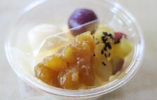 珍しいみりんゼリーとほうじ茶ゼリーの他に、わらび玉、羽二重餅、黒豆鹿の子、そしてあんずが入っています。バラエティ豊かな素材が入りながらどれも上品な甘さで喉ごしすっきり、というこだわりの大人向けスイーツ。暑い日にぴったりですよ!
