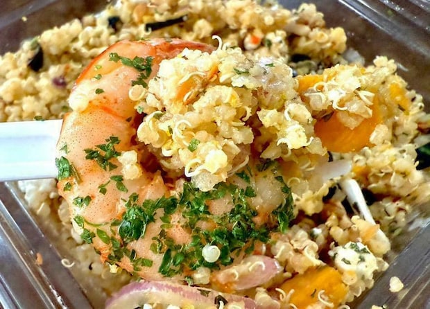キアヌに、フェタチーズ、ドライクランベリー、ブラックオリーブ、エビ、クルミなどの具材も入り、オリーブオイル、ドライトマトでシンプルに味付け。