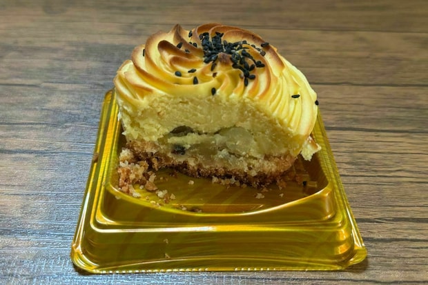中は5層になっており、下からバターケーキ・香ばしい風味が特徴のジャンドゥーヤペースト・コクがたっぷり純生クリーム・ふわっと軽めのスポンジ・旬の新栗のペーストがたっぷり重なっています。