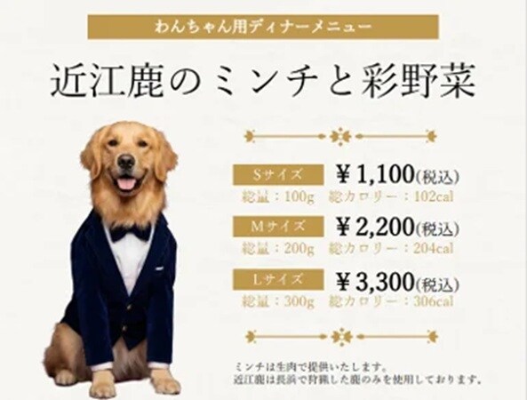 わんちゃん用ディナーメニュー「近江鹿のミンチと彩野菜」のSサイズは1,100円(税込)で総量100g・総カロリー102cal、Mサイズは2,200円(税込)で総量200g・総カロリー204cal、Lサイズは3,300円(税込)で総量300g・総カロリー306calだ。