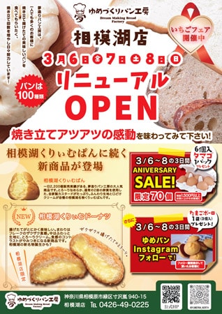 神奈川県相模原市・相模湖エリアにあるベーカリー「夢造りパン工房 相模湖店」は、3月6日(金)にリニューアルオープンする。